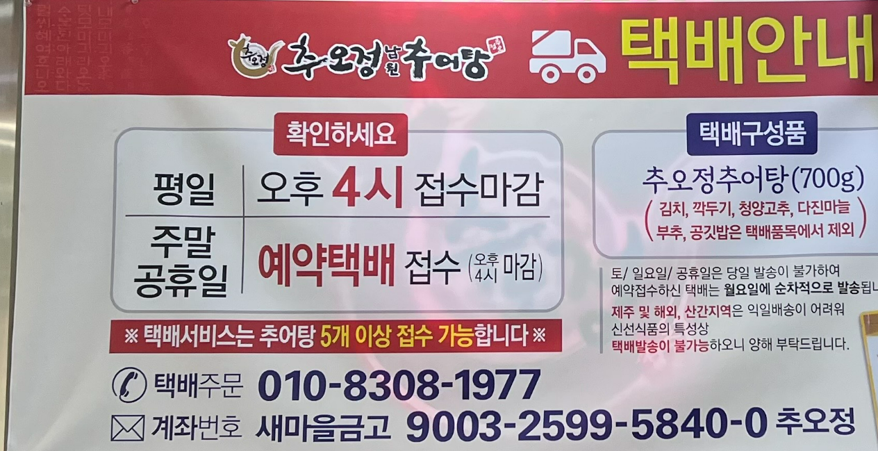 삼막사 맛집 추오정 남원추어탕 메뉴판.